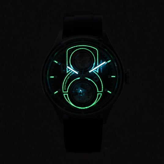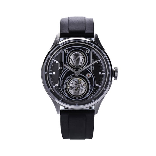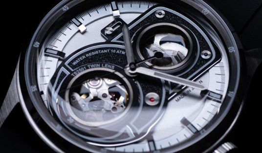 文字盤2つの円形ガラス開口部からみえるムーブメント動作