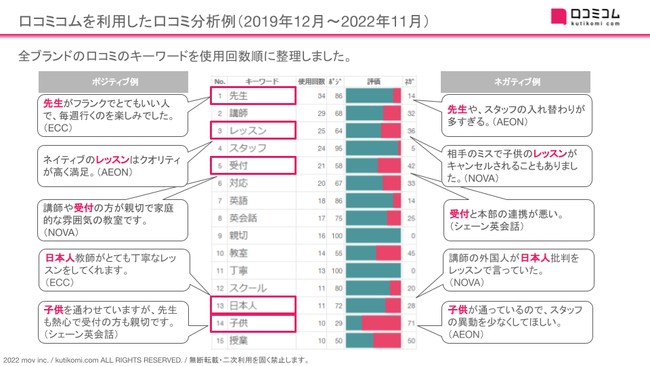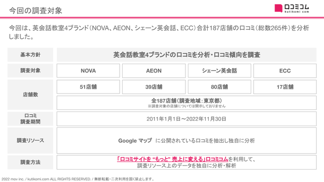 今回は、英会話教室4ブランド(NOVA、AEON、シェーン英会話、ECC)合計187店舗に寄せられた265件の口コミを分析しました。
