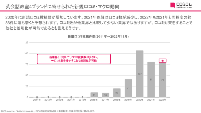 2021年以降は口コミ数が減少し、2022年も2021年と同程度の約86件に落ち着くと予想されます。