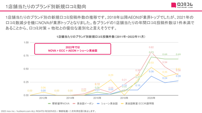 1店舗当たりのブランド別の新規口コミ投稿件数の推移です。2018年以降AEONが業界トップでしたが、2021年の口コミ数減少を機にNOVAが業界トップとなりました。
