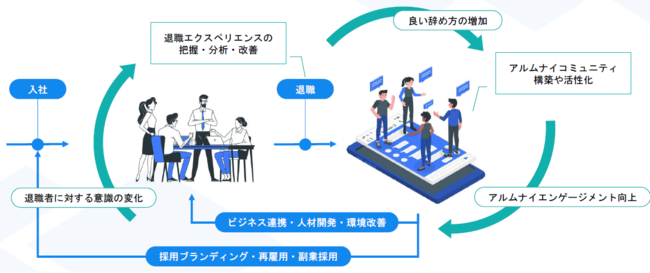 そして、『Official-Alumni.com』にて、“アルムナイ”と企業とのコミュニケーションだけではなく、“アルムナイ”同士の交流も促進させ、両者の関係構築をサポートすることで、“アルムナイ”が貴重な人的資本となり、そのつながりを活用することが可能となります。