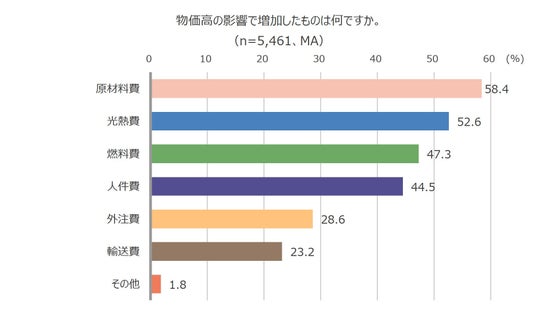 経営する会社で物価高の「影響がある」と回答した5,461名を対象に、物価高の影響で増加したものは何か聞いたところ、最多が「原材料費」(58.4%)、続いて「光熱費」(52.6%)、「燃料費」(47.3%)となりました。