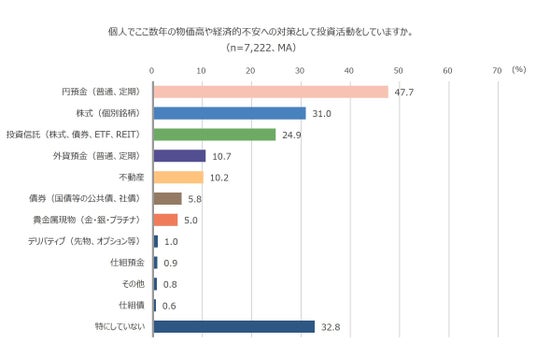 - ここ数年の物価高や経済的不安への対策のための投資活動について、個人としては「円預金(普通、定期)」が47.7%、会社としては「特にしていない」が60.1%で最多に