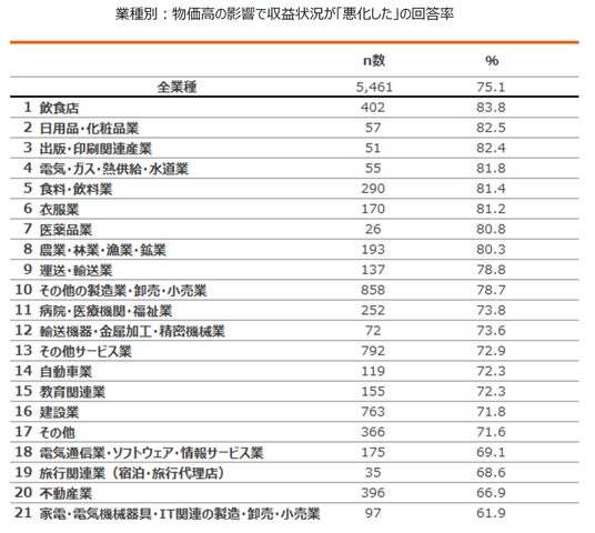 物価高の影響で収益状況が「悪化した」という回答を業種別に見ると、「飲食店」(83.8%)が最も高く、次いで「日用品・化粧品業」(82.5%)、「出版・印刷関連産業」(82.4%)となりました。