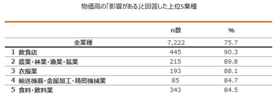 また、物価高の「影響がある」という回答を業種別に見ると、「飲食店」(90.3%)が最も高く、次いで「農業・林業・漁業・鉱業」(89.8%)、「衣服業」(88.1%)となりました。