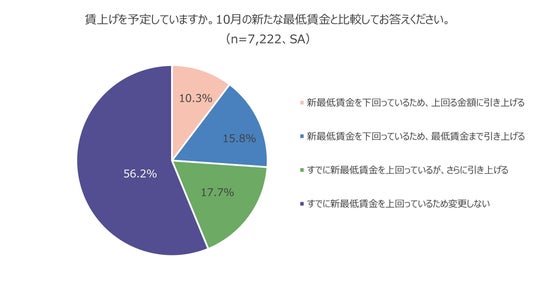 中小企業経営者7,222名に、2024年10月に最低賃金の目安が引き上げられたが賃上げを予定しているか聞いたところ、最も多かったのは「すでに新最低賃金を上回っているため変更しない」(56.2%)でした。また、「すでに新最低賃金を上回っているが、さらに引き上げる」は約2割(17.7%)でした。