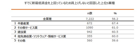 - 2024年10月に最低賃金の目安が引き上げられたことに関連し、賃上げを予定しているかについて「すでに新最低賃金を上回っているため変更しない」が最多で56.2%。業種別に見ると「不動産業」では67.4%が「すでに新最低賃金を上回っているため変更しない」と回答