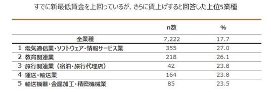 各項目の回答率を業種別に見ると、「すでに新最低賃金を上回っているため変更しない」は「不動産業」(67.4%)、「すでに新最低賃金を上回っているが、さらに引き上げる」は「電気通信業・ソフトウェア・情報サービス業」(27.0%)が最も高い結果となりました。