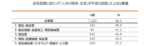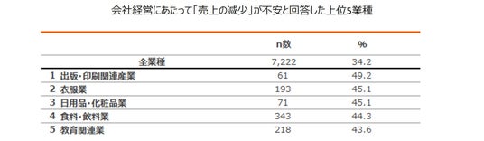 - 会社経営にあたって不安なことは、「売上の減少」が34.2%で最多に。業種別に見ると、「出版・印刷関連産業」では49.2%が「売上の減少」が不安と回答