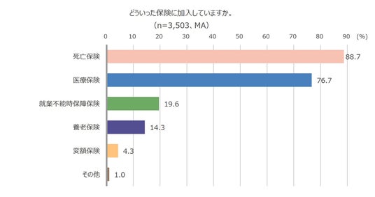 個人契約または法人契約の「生命保険への加入」と回答した3,503名を対象に、どういった保険に加入しているか聞いたところ、最多が「死亡保険」(88.7%)、続いて「医療保険」(76.7%)、「就業不能時保障保険」(19.6%)という結果になりました。