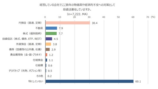 一方で経営する会社では「円預金(普通、定期)」が30.4%、「不動産」が7.9%、「株式(個別銘柄)」が7.7%となり、「特にしていない」は60.1%という結果でした。