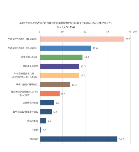 中小企業経営者7,222名に、病気や事故等で経営離脱を余儀なくされた場合に備えて実施していることはあるか聞いたところ、「生命保険への加入(個人契約)」が37.2%、「生命保険への加入(法人契約)」が22.6%、「損害保険への加入」が18.8%となり、「特にない」は34.2%でした。