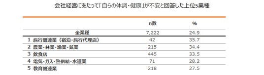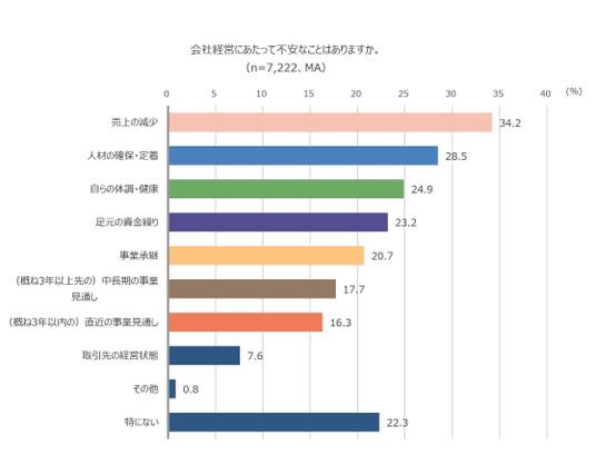 中小企業経営者7,222名に会社経営にあたって不安なことはあるか聞いたところ、最多が「売上の減少」(34.2%)、続いて「人材の確保・定着」(28.5%)、「自らの体調・健康」(24.9%)でした。