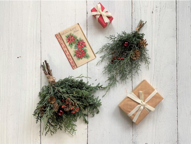 左上:ハッピーホリデーズブーケは花瓶等でブーケとして飾っても、壁にかけてスワッグとしても楽しめます。お好みのリボンやオーナメントを加えてカスタマイズして楽しんで。