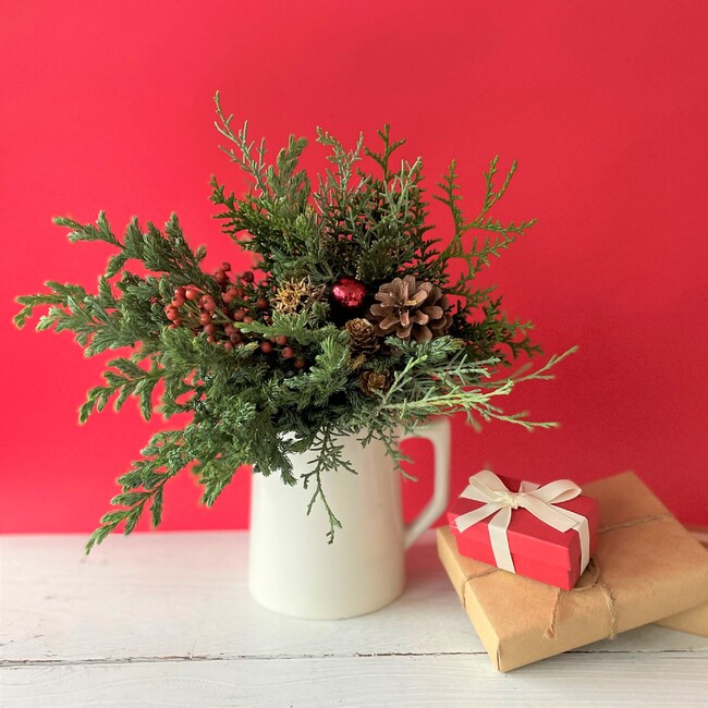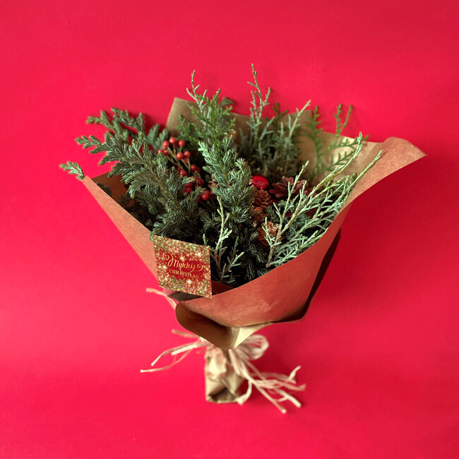 クリスマスにぴったりなブーケ。ちょっとした贈り物やご自宅用にもおすすめです。ドライフラワーにもなるのでスワッグとしても、カスタマイズして正月飾りにも。