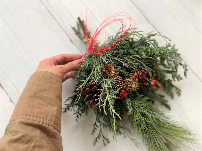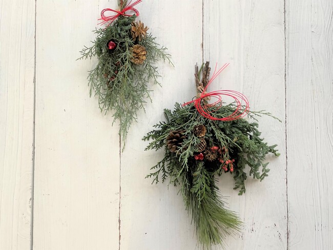 今回は、ツリー型に仕上げたアレンジメントと、花瓶でもスワッグでも楽しんでいただけるたっぷりのエバーグリーンを使った3つのアイテムをご用意しました。お手持ちのアイテムで正月らしさを加えれば簡単に正月飾りにリメイクできます。