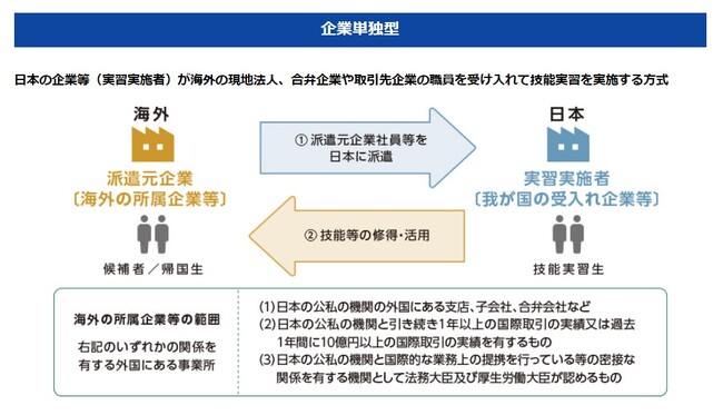 企業単独型にあっては、日本の企業等(実習実施者)が、直接、海外の現地法人、合弁企業や取引先企業の職員を受け入れて、技能実習を実施することになります。団体監理型にあっては、事業協同組合や商工会等の営利を目的としない団体(監理団体)が技能実習生を受け入れて、傘下の企業等(実習実施者)が技能実習を実施することになります。