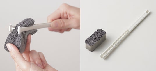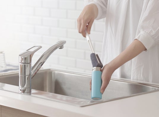 『ボトル洗いスポンジ』は、スポンジ表面(アクリル素材)にマーナ独自の技術である「ハード樹脂加工」を施し、洗剤を使用しなくても水だけで茶しぶ汚れを落とせます。ハンドルとスポンジ表面は抗菌加工を施しており衛生的です。コシのあるスポンジをハンドルで両側から挟む構造で、力を込めて洗いやすく、スポンジ部分は交換が可能です。