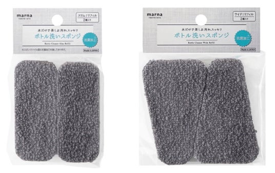 様々なサイズのボトルに対応できるよう、2サイズご用意いたしました。口径約31mm以上に対応の『ボトル洗いスポンジスリム』は細めのボトルやグラスが洗いやすく、口径約45mm以上に対応の『ボトル洗いスポンジワイド』は口の広いボトルや冷水筒が洗いやすいサイズです。交換用リフィル(2個入り)も併せて発売いたします。