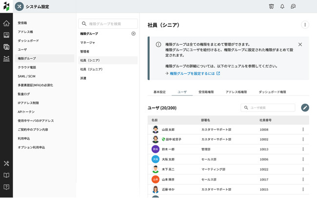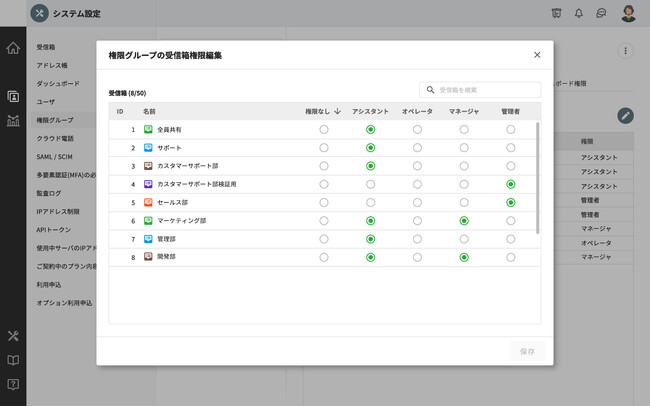 『Re:lation』は、機能(受信箱・アドレス帳・ダッシュボード)の権限管理をユーザごとに持ち、どのようなお客様の業務体制にあっても円滑に運用いただける基盤を持っています。