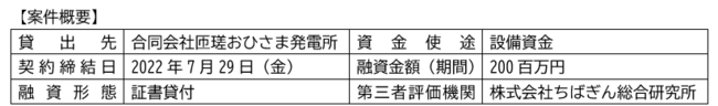 貸出先の合同会社匝瑳おひさま発電所は、2022年4月に営農型太陽光発電事業を手掛けるために設立された特別目的会社で、市民エネルギーちば株式会社、株式会社匝瑳おひさま畑、ENEOSイノベーションパートナーズ合同会社、SBIエナジー株式会社、株式会社アグリツリーの5社が出資しています。本ローンにて調達した資金は、営農型太陽光発電設備(千葉県匝瑳市)の開発資金へ全額充当されています。