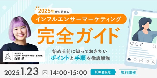 株式会社A(https://acetokyo.com/)は、「2025年から始めるインフルエンサーマーケティング完全ガイド ~始める前に知っておきたいポイントと手順を徹底解説~」と題した無料ウェビナーを1月23日(木)にオンラインで開催します。