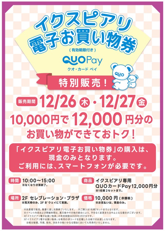 12月26日(木)、27日(金)の2日間開催する「イクスピアリ電子お買い物券特別販売」は、昨年からアップデート!紙のお買い物券から電子の「QUOカードPay」にお買い物券の形式が変わります。2,000円分のプレミアム付きは昨年までと同様、よりカンタン便利にイクスピアリでご利用いただけます。