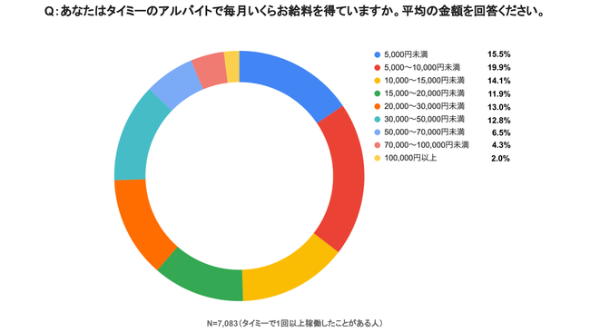 タイミーのバイトで得た毎月の収入の中央値は、1ヶ月あたり15,000~20,000円程度。