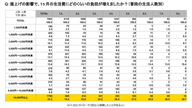 値上げの影響により、1ヶ月の生活費が10,000円以上が増えたと回答した人は25.3%で、前回の調査結果から6.2ポイント増加し、初めて20%を超えた。