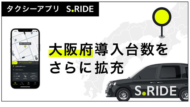タクシーアプリ 「S.RIDE(エスライド)」を提供するS.RIDE株式会社(本社:東京都港区、代表取締役:橋本洋平、以下S.RIDE)は、2023 年12月5日(火)より大阪府において、梅田交通グループが保有するタクシー車両 計54両で、タクシーアプリ「S.RIDE」のサービス導入を順次開始したことをお知らせします。今回の梅田交通グループの導入により、大阪市域交通圏において700台を超える車両で「S.RIDE」が利用可能となりました。