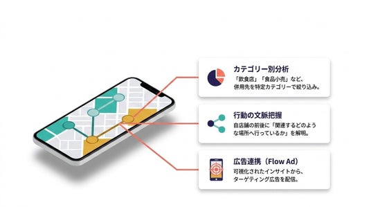 Location AI株式会社(本社:東京都渋谷区、代表取締役:小尾一介)は、自社開発のクラウド型人流データ活用プラットフォーム「Location AI Platform(R)(LAP)」において、特定の場所を訪れた人の来訪前後の行動を、飲食、食品、小売、ドラッグストアなどの施設カテゴリ単位で分析・可視化し、広告配信まで連携できる新機能を発表いたしました。