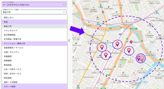 今回のアップデートにより、新たにホームPOIを中心に半径5km以内などの範囲で、「飲食」や「スポーツ施設」といった施設カテゴリ単位での分析が可能になりました。