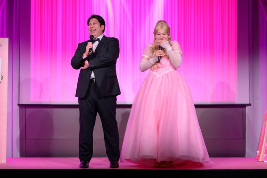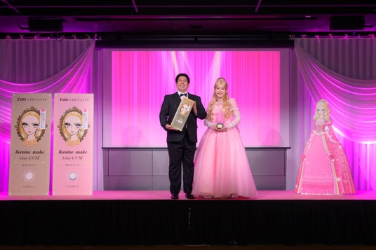 アワードの審査員として、お笑いコンビ「レインボー」のジャンボたかおさんが登壇。今回どのような審査を心掛けたのか質問されると、「『ヒロインのように、思わず見つめたくなる瞳』を選びました。きれいなだけでなく “印象に残る美しさ”が審査の決め手です。」と独自の審査基準についてダンディーに囁くような口調で語りました。その後、司会者より審査員のジャンボさんが選ぶ、アイメイク発想のカラコン「ヒロインメイク 1day UV M」の「輝く瞳アワード2025」グランプリ受賞者がステージに呼び込まれると、なんと相方・池田直人さんが、ピンクのドレスをまとったヒロイン姿で笑顔を振りまきながら登場。グランプリ受賞の感想を聞かれると「ありがとうございます。カラコンを装用することでどれほど可愛く、印象的になれるかを自ら体現しました!瞳は全てを映します。今日の瞳は、何度も何度も鏡を見ました。本当にお気に入りの瞳でございます。」と目を潤ませながらコメント。衣装に関して、ふんわりピンクのドレス姿で、まるでヒロインメイクのキャラクター「エリザベート・姫子」のようですねと問いかけられると、「そうなんです……これは、姫子をイメージしたドレスなんですよ。」と自身の衣装が姫子をイメージしていたことを明らかにしました。