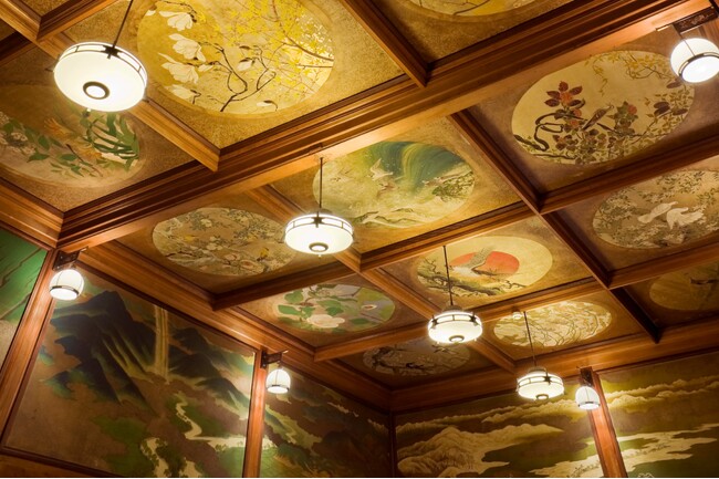 昭和初期の開業時、大勢の大工、庭師、絵師、象嵌師、塗師らが集い、匠の技を結集して造られた本建造物には、伝統的な美意識と昭和初期のモダニズムが息づいており、2009(平成21)年3月に東京都の有形文化財に指定されました。その意匠を未来まで繋いでくための活動として、この度、漁樵の間の美術品の修復をはじめとする建物内の保全修復作業を実施いたします。