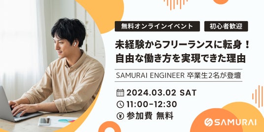 プログラミングスクール「SAMURAI ENGINEER(侍エンジニア)」を運営する株式会社SAMURAIは、無料オンラインイベント「未経験からフリーランスに転身!自由な働き方を実現できたワケ」を、3月2日(土)11時より開催します。