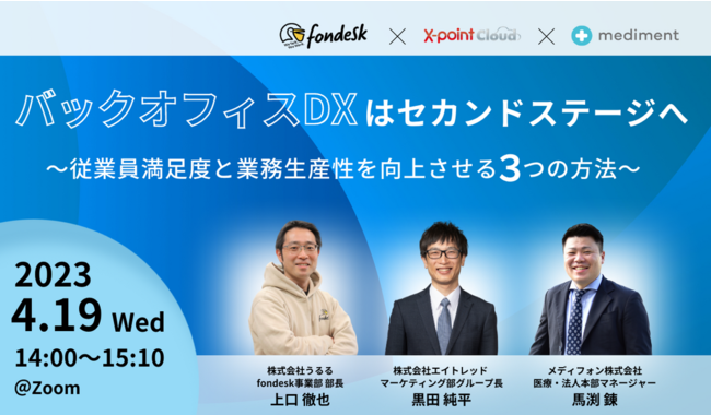 業務手続きの電子化(ワークフローシステム)大手の株式会社エイトレッド(本社:東京都渋谷区、代表取締役社長:岡本 康広 以下、エイトレッド)は、メディフォン株式会社、株式会社うるると共催で『バックオフィスDXはセカンドステージへ ~従業員満足度と業務生産性を向上させる3つの方法~』を2023年4月19日(水)にオンラインにて開催いたします。