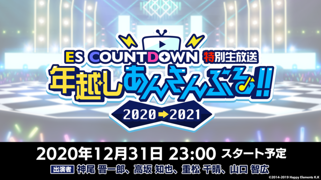 ニコニコ生放送では、12月31日(木)23:00より「ES COUNT DOWN 特別生放送 年越しあんさんぶる!! 2020→2021」を生放送いたします。
