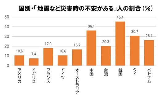 なお、不安要因は国によって異なっており、例えば「地震など災害時の不安がある」との回答した人の割合は、韓国が45.4%と最も高くなっているほか、中国、タイ、ベトナムなどのアジアの人が、欧米と比べるとかなり高くなっています【図表7】。