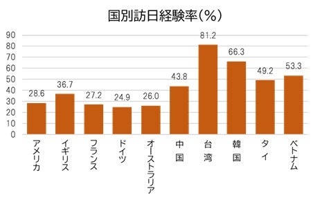 最初に、今回調査対象とした10か国・地域における訪日経験者の割合を比較してみました【図表2】。すると最も多いのは台湾で8割を超えています、次いで韓国、ベトナムの順で高くなりました。