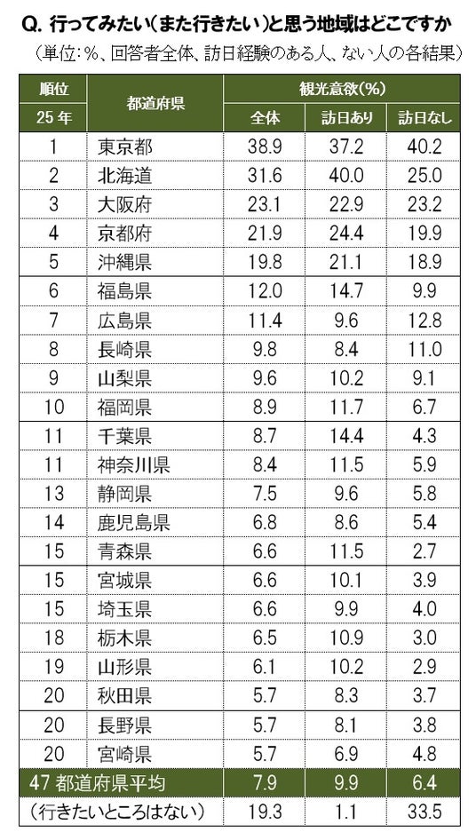 その結果(観光意欲)が最も高かったのは東京都で、38.9%が「行ってみたい(また行きたい)」と回答しました。2位以下は北海道、大阪府、京都府、沖縄県という順になりましたが、6位には福島県、7位には広島県がランクインしています。