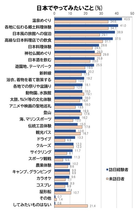 「各地に伝わる郷土料理体験」は訪日経験者では41.0%、未訪日者では温泉めぐりを上回る34.7%。「高級な日本料理店での飲食」や「日本料理体験」、「日本酒を飲む」など、日本の食に対するニーズも高いようです。