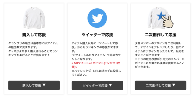 夕闇メンバーのデザインを二次利用して、デザインをアレンジしたり、他のアイテムにデザインをしたりして、販売をすることができます。コチラの販売枚数が引用元のメンバーのポイントに加算され優勝に貢献することができます。