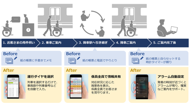 従来、車いすや白杖などの利用者が列車を乗降される際、乗降駅係員の習熟した連携作業によって安全・利便性が保たれてきました。一連の案内業務は、乗車駅より電話連絡を受け、降車駅の係員が詳細を紙の連絡票に記録し、記録内容を参照しながらホームにて当該の利用者をお迎えする流れとなるため、連絡不備の防止や限られた人員でのサービス品質の向上など、公共交通機関の利用者のさらなる安全安心な環境整備と係員の業務負荷軽減が課題となっています。