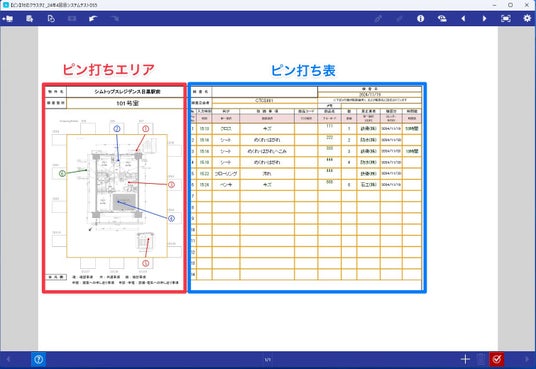 紙の図面上でその場所を●などでマークし、その場所から線を引き図面の外に番号を記載し、対応する別表に該当箇所の不具合内容の詳細の記録や写真の添付を行う業務の効率化を目的とした機能です。
