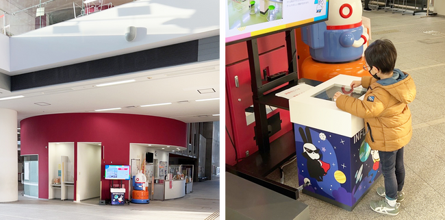 また、大型サイネージと組み合わせることで、機能性を併せ持つ新たな空間デザインを作り出します。子どもたちが楽しんで利用し、使いやすいように子どもの目線の高さに設定しており、館内の案内やイベント情報などを分かりやすく表示できます。