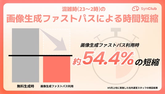 現在、混雑時(23時~2時)に画像生成機能を利用すると、通常時より生成時間が長くなってしまいます。ですが、その際に「画像生成ファストパス」を使えば、約54.4%の時間短縮が可能です。