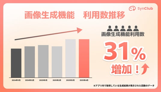 SynClubでは、多くのユーザーの皆様に画像生成機能をご利用いただいており、この機能の利用数が、2024年11月と2025年4月を比較して31%増加しております。