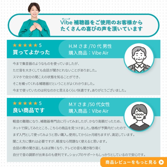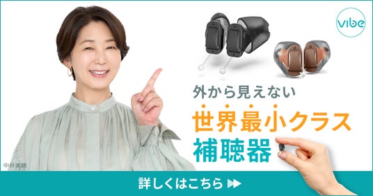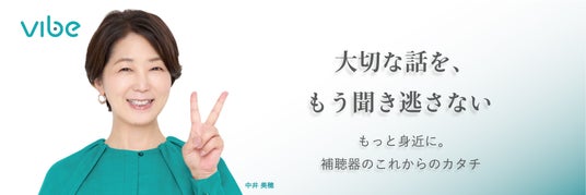 「補聴器には興味があるけど、なんだか敷居が高く・・・」と最初の一歩を踏み出せない多くの方々に対して、当社は「もっと身近にもっと簡単に」をコンセプトにしたVibe(ヴィーブ)補聴器を販売しています。中井美穂さんの知名度、好感度、健康に関するポジティブなイメージから、この方しかいないと思い、2024年6月から起用させていただきました。Vibe補聴器は、聞こえを取り戻した時の喜びをV(ブイ)サインで表していますが、今では、中井美穂さんのVサインがすっかりオンラインストアのシンボルになっています。今後も、中井美穂さんとともに、補聴器の普及率拡大を目指していきたいと思います。
