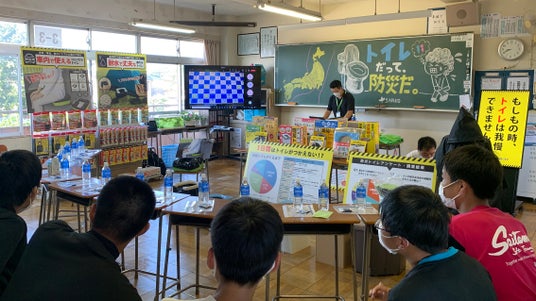 蓮田市立黒浜西中学校で行われた第7回黒西中「防災キャンプ」に参加し、災害時のトイレの重要性と簡易トイレの組立方法を、生徒に向けてレクチャーいたしました