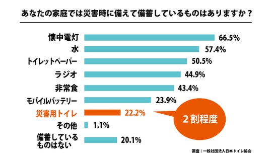 一般社団法人日本トイレ協会の調査※1によると、災害時に備えた備蓄状況については、懐中電灯66.5%、非常食43.4%に対し、トイレは22.2%という調査結果が出ており、トイレの備蓄率が低い傾向にあります。一方で、大地震によりトイレが使えなくなる場合があることを知っているかという問いに対しては、77.2%が知っていると回答しており、認知に対して備蓄が不足していることが分かります。